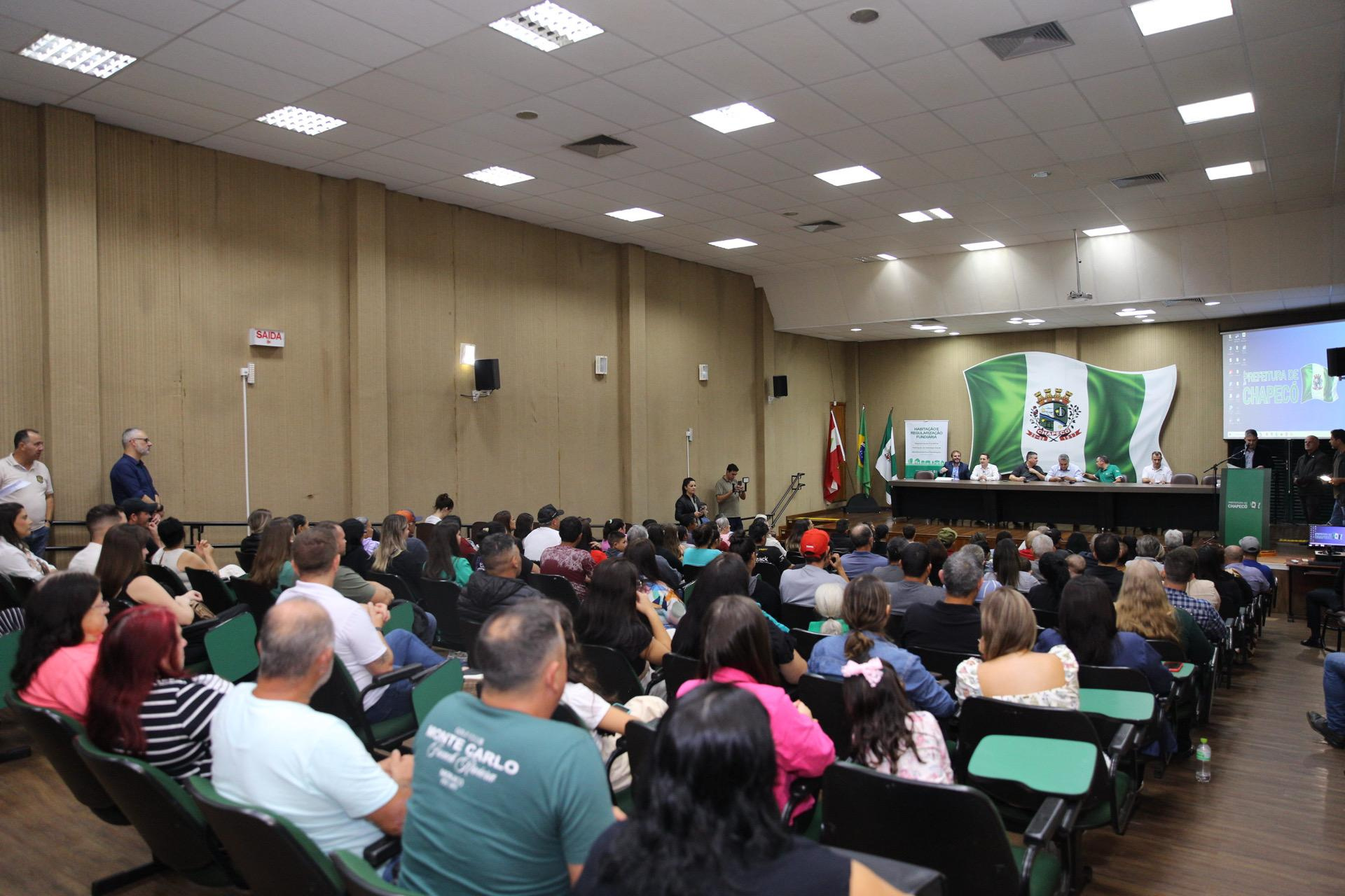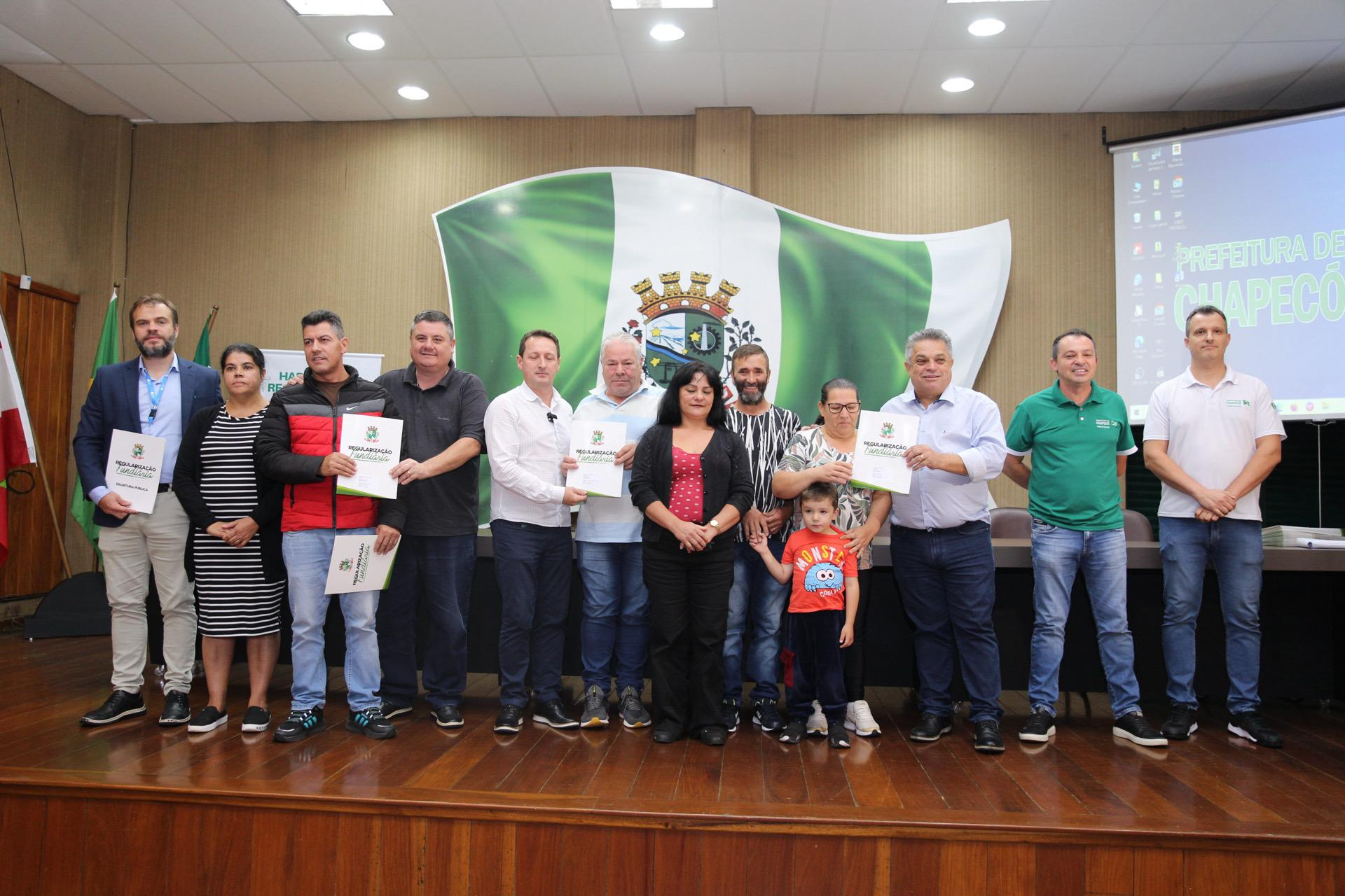 A Prefeitura de Chapecó, por meio da Diretoria de Habitação e Regularização Fundiária, realizou nesta terça-feira (15), solenidade de entrega de Registros de Matrícula dos Imóveis regularizados nos núcleos urbanos Lions Club, Rotary Club e Ecoparque, e das Certidões de Regularização Fundiária (CRFs) do núcleo Tietê. Os atos de entrega foram realizados no auditório da prefeitura.