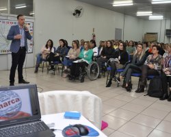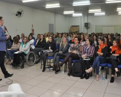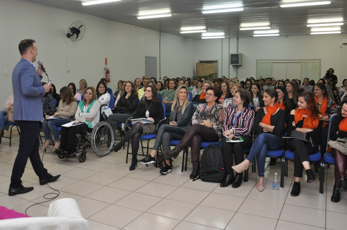 Cerca de 150 profissionais da equipe técnica da Secretaria Municipal de Educação e os professores que atuam na Educação de Jovens e Adultos da Rede Municipal de Ensino de Chapecó, participaram de Palestra Motivacional Sua Marca Relações Interpessoais proferida por Breno Ferigollo Filho, que abordou o tema de forma direcionada aos profissionais da educação presentes com foco no trabalho de equipe.