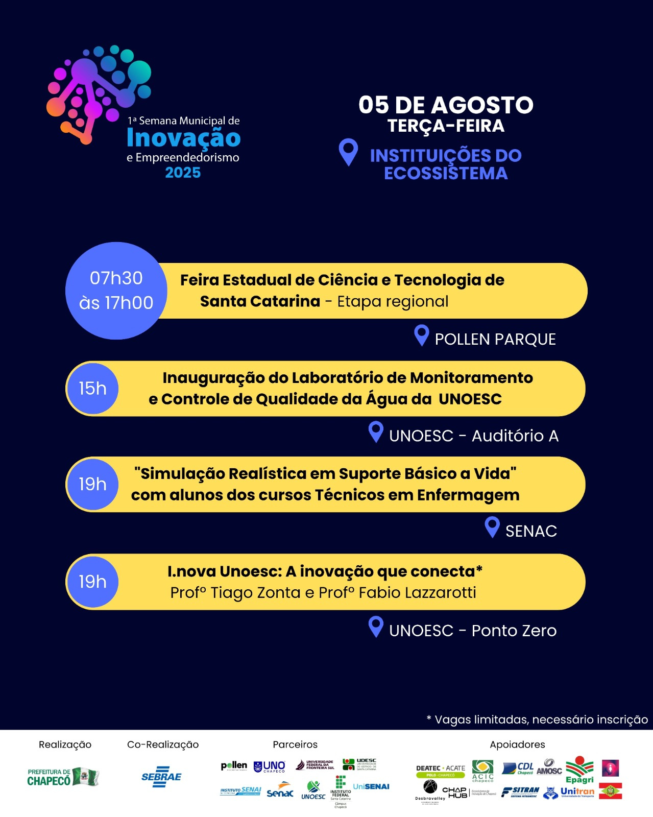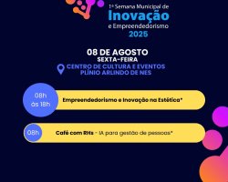 A Prefeitura de Chapecó, por meio da Secretaria de Desenvolvimento Econômico, Turismo e Inovação, realiza de 04 a 08 de agosto, em Chapecó, a Primeira Semana Municipal de Inovação e Empreendedorismo. O evento que acontecerá no Centro de Eventos Plínio Arlindo de Nes, conta com apoio das universidades, empresas, instituições públicas, entidades setoriais e organizações da sociedade civil que compõem o ecossistema local de inovação.