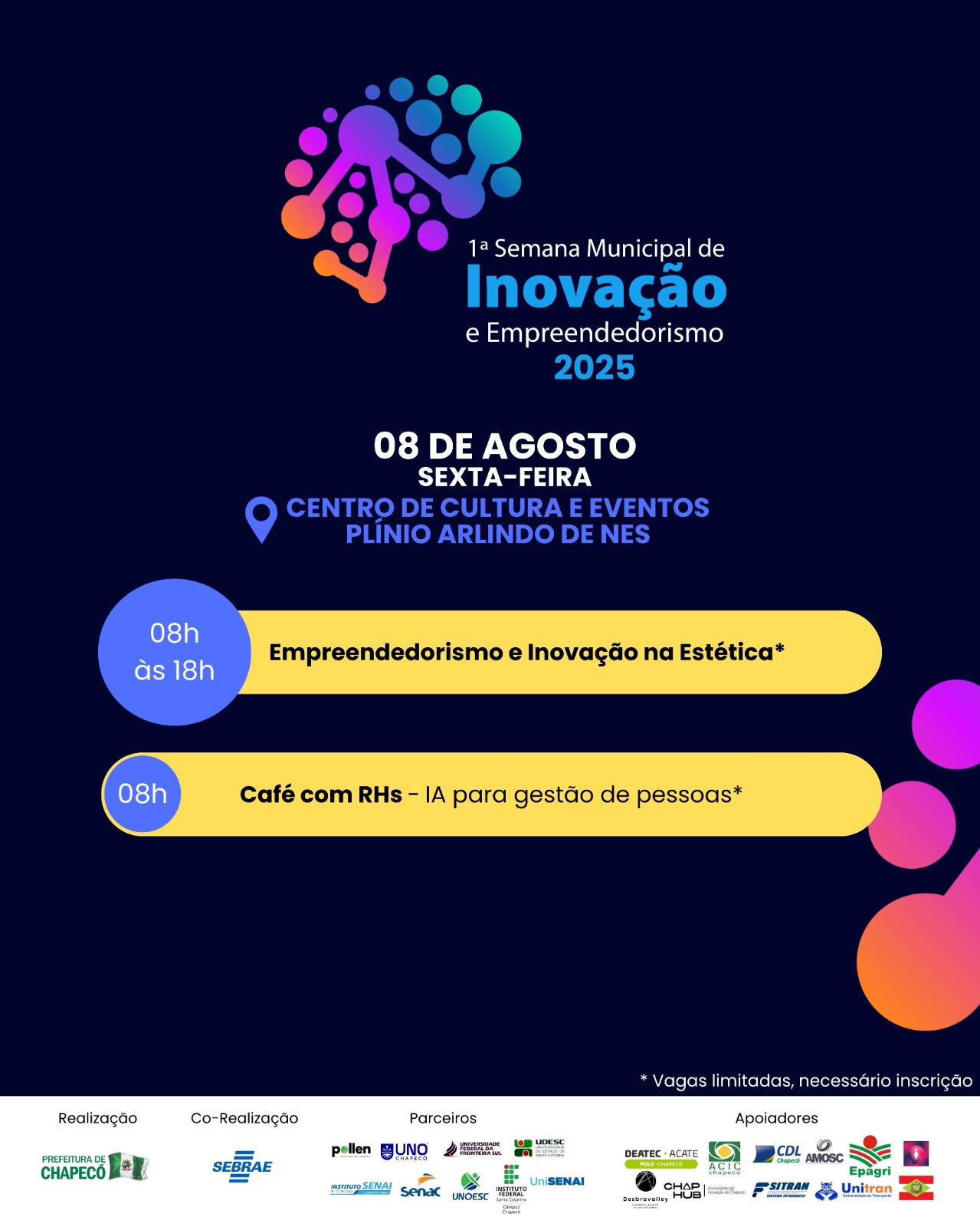 O secretário de Desenvolvimento Econômico, Turismo e Inovação, Márcio da Paixão Rodrigues, disse que no evento serão apresentadas as principais inovações desenvolvidas pela Prefeitura de Chapecó, com destaque para o programa estratégico Chapecó Inovadora. Queremos aproximar pessoas, instituições e soluções, promovendo conexões entre setores estratégicos e respondendo a desafios concretos do território com criatividade, tecnologia e impacto social.