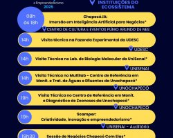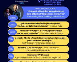 A abertura da semana está prevista para o dia 04 de agosto, às 19h, com a presença de autoridades e na sequência palestra magna com Magno Maciel, pesquisador com passagem pela OpenAI (criadora do ChatGPT), sobre a inteligência artificial como tecnologia estruturante para o desenvolvimento do país. No dia 05, haverá imersão em Inovação no Agronegócio, com foco em tecnologias, pesquisas e soluções voltadas à produção sustentável e segurança alimentar, com participação da Epagri, universidades e empresas. Painel: Cenários da Inovação em Chapecó - Márcio da Paixão e convidados. Painel Internacional de Inovação Social com Oscar Santiago Uribe Rocha, ex-diretor de Resiliência de Medellín, Colômbia. No dia 06, estão previstas oficinas de IA para profissionais da saúde e imersão em compras públicas para inovação. Já no dia 07, a partir das 8h, acontecerá imersão em Inteligência Artificial para Negócios, com workshops, experiências e demonstrações aplicadas. E no último dia, 08 de agosto, haverá encerramento com evento sobre inovação e empreendedorismo na área da estética, reunindo profissionais, marcas e tendências do setor.