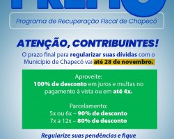 A prefeitura de Chapecó, por meio da secretaria de Fazenda, lembra que o prazo para adesão ao Programa de Recuperação Fiscal (PREFIC) vai até o dia 28 de novembro de 2025.