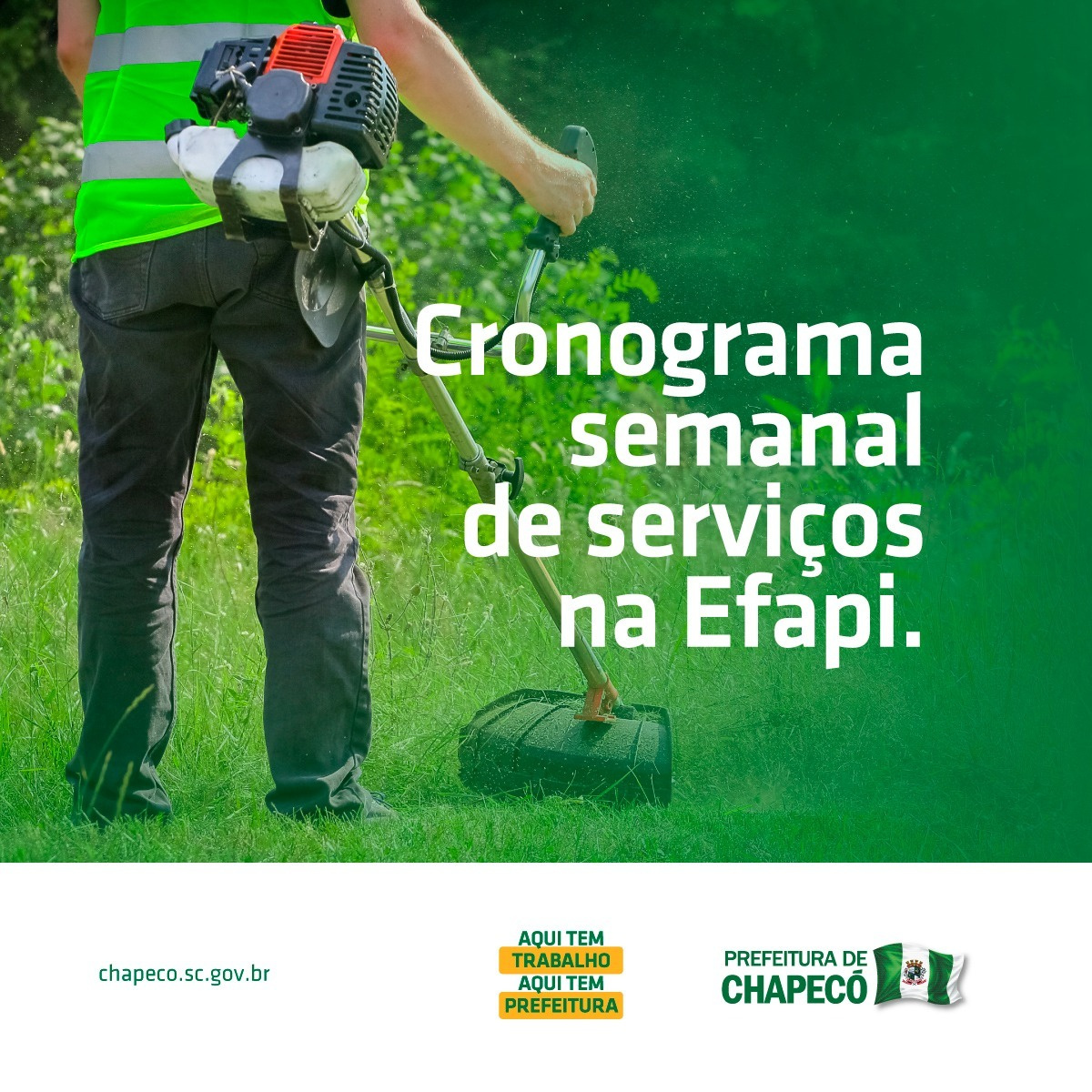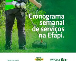 A Superintendência da Grande Efapi informa o cronograma de atividades previstas para esta semana (29 de agosto a 03 de outubro). O cronograma poderá sofrer alterações devido às condições climáticas.