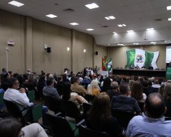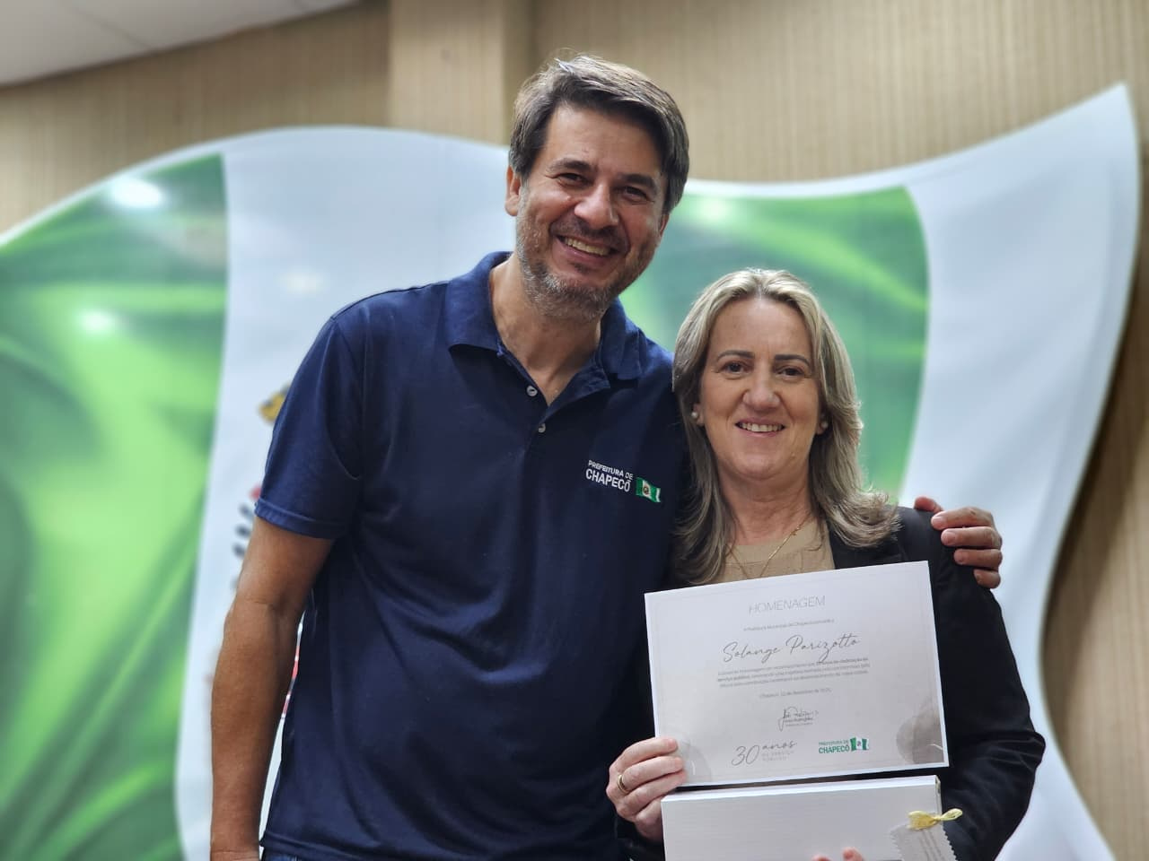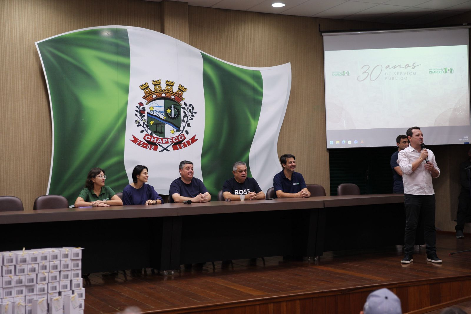 A Prefeitura de Chapecó, por meio da secretaria de Administração, realizou na manhã desta sexta-feira (12) o Jubilados 2025, uma homenagem aos servidores municipais com 30 anos de serviço público. Foram 92 pessoas que participaram do ato no auditório da Prefeitura e receberam um certificado e uma garrafa térmica de água.