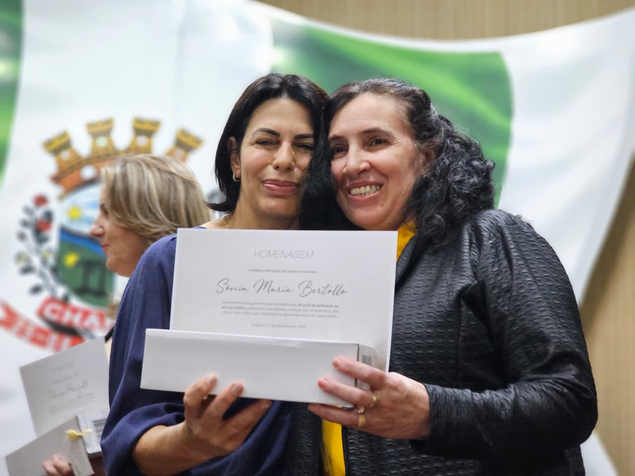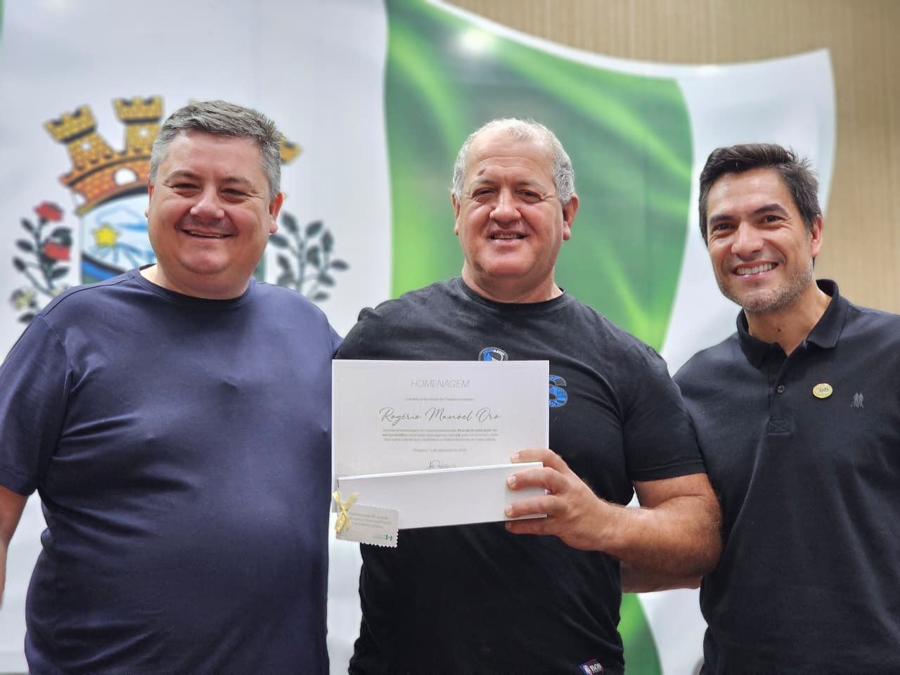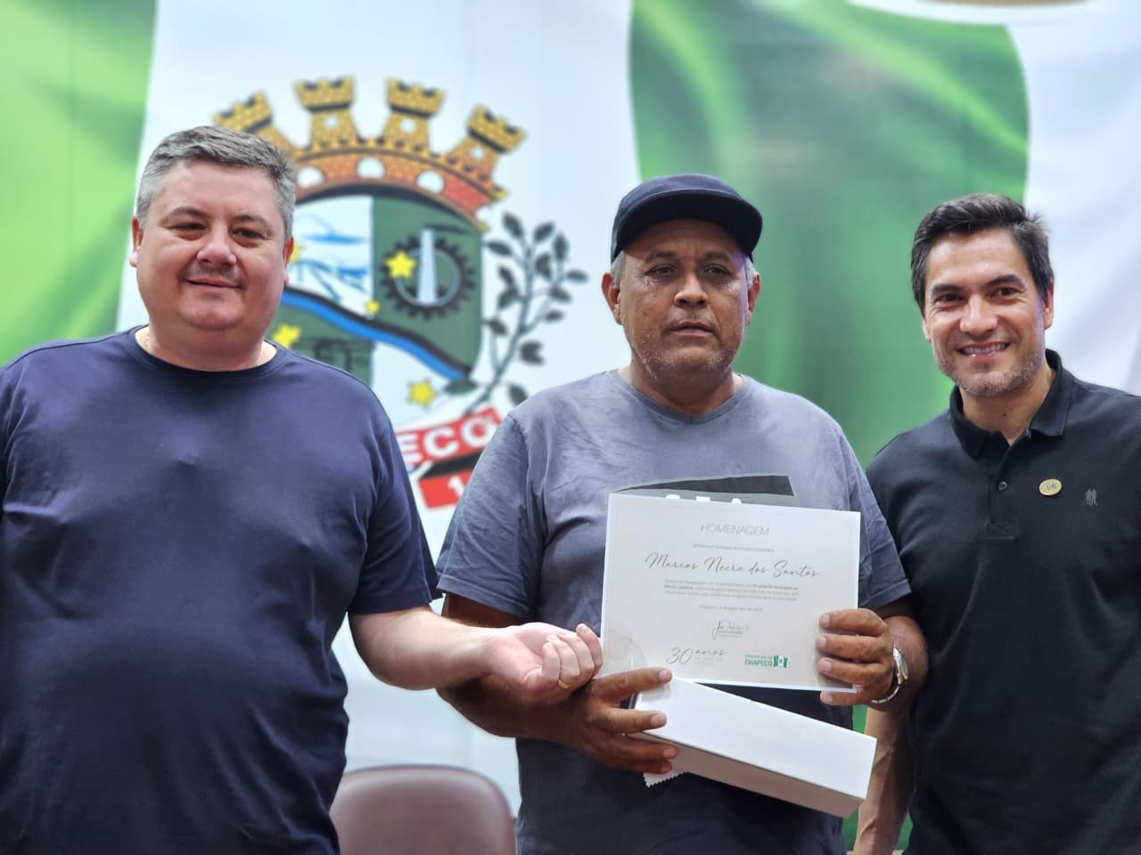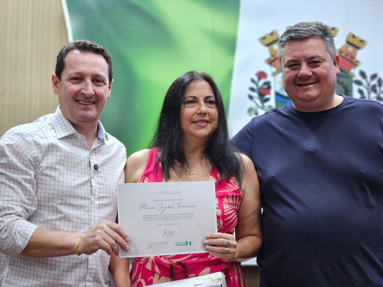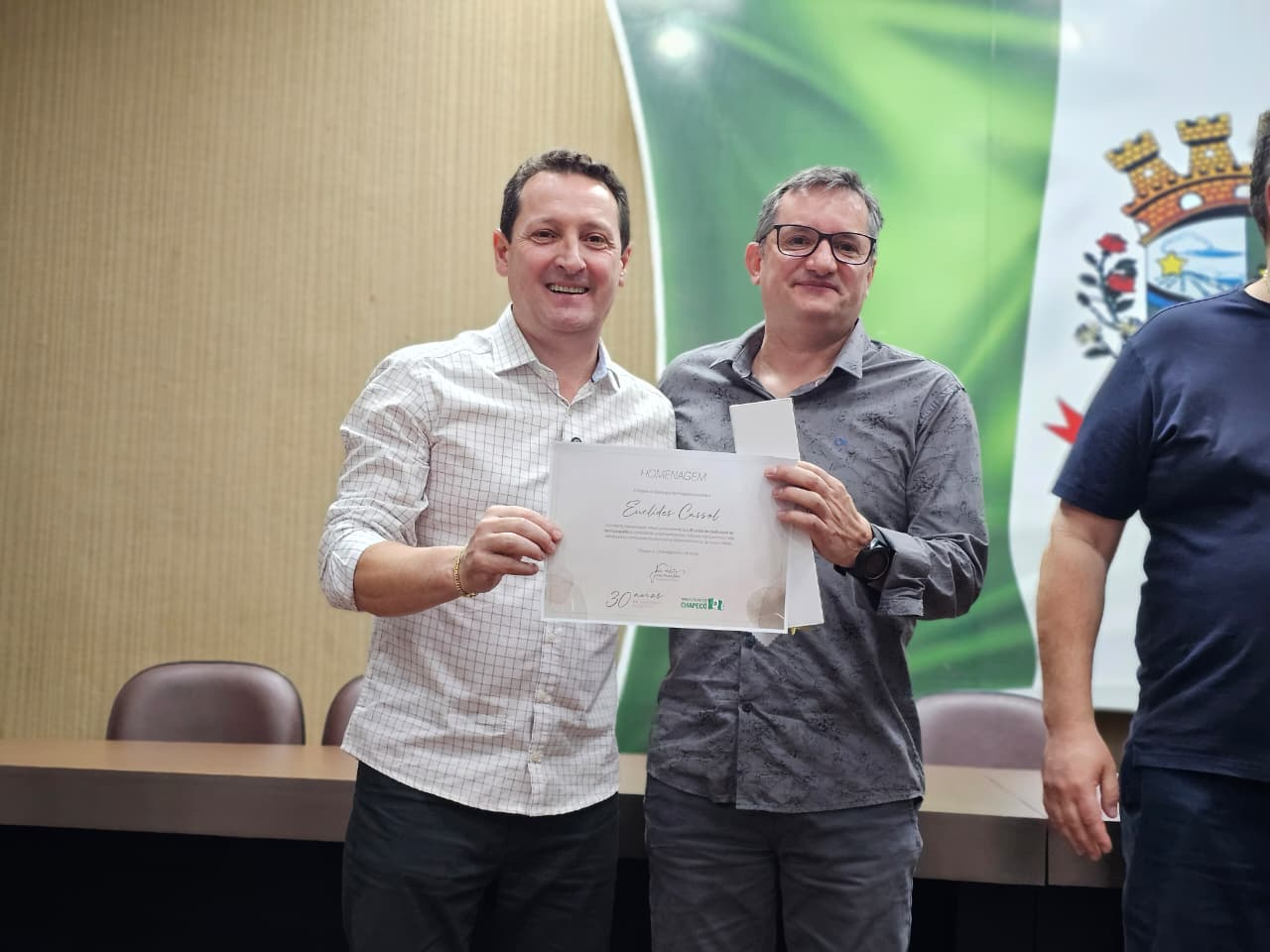 O presidente da Câmara de Vereadores, Claimar de Conto foi um dos homenageados e falou em nome dos colegas. Cada um aqui tem uma história de trabalho nesses 30 anos. Desde 1995 tivemos um período de transformação do nosso município, com quatro mandados do prefeito João Rodrigues. Tivemos seis Jogos Abertos, com a recente conquista de campeão geral. Saímos de 140 mil habitantes, para 282 mil habitantes. Éramos mil servidores, agora são sete mil. Cada um deu sua contribuição. Nós temos o dom de servir a população de Chapecó, disse Claimar.