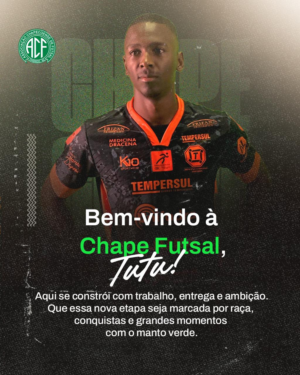 "Raça, comprometimento e vontade não vão faltar. Vamos, Chape!", disse Tutu, o quarto novo contratado anunciado pela Chapecoense. Antes dele, foram confirmados o goleiro Alê Falcone (ex-Atlântico/RS), o fixo Nogueira (ex-Marreco/PR) e o pivô Hulk (ex-Manoel Ribas/PR).