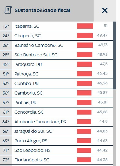 A Prefeitura de Chapecó é a segunda no sul do país e a 24a do Brasil com melhor índice de sustentabilidade fiscal, segundo ranking do Centro de Liderança Pública. Segundo o estudo, a sustentabilidade fiscal de um município é condição fundamental para a provisão e manutenção de bens e serviços públicos, para a garantia de capacidade de investimento pela gestão pública e para a atração de investimentos privados. A sustentabilidade fiscal gera credibilidade junto aos contribuintes, empresas e investidores nacionais e internacionais, estimulando os negócios privados e a geração de riqueza.