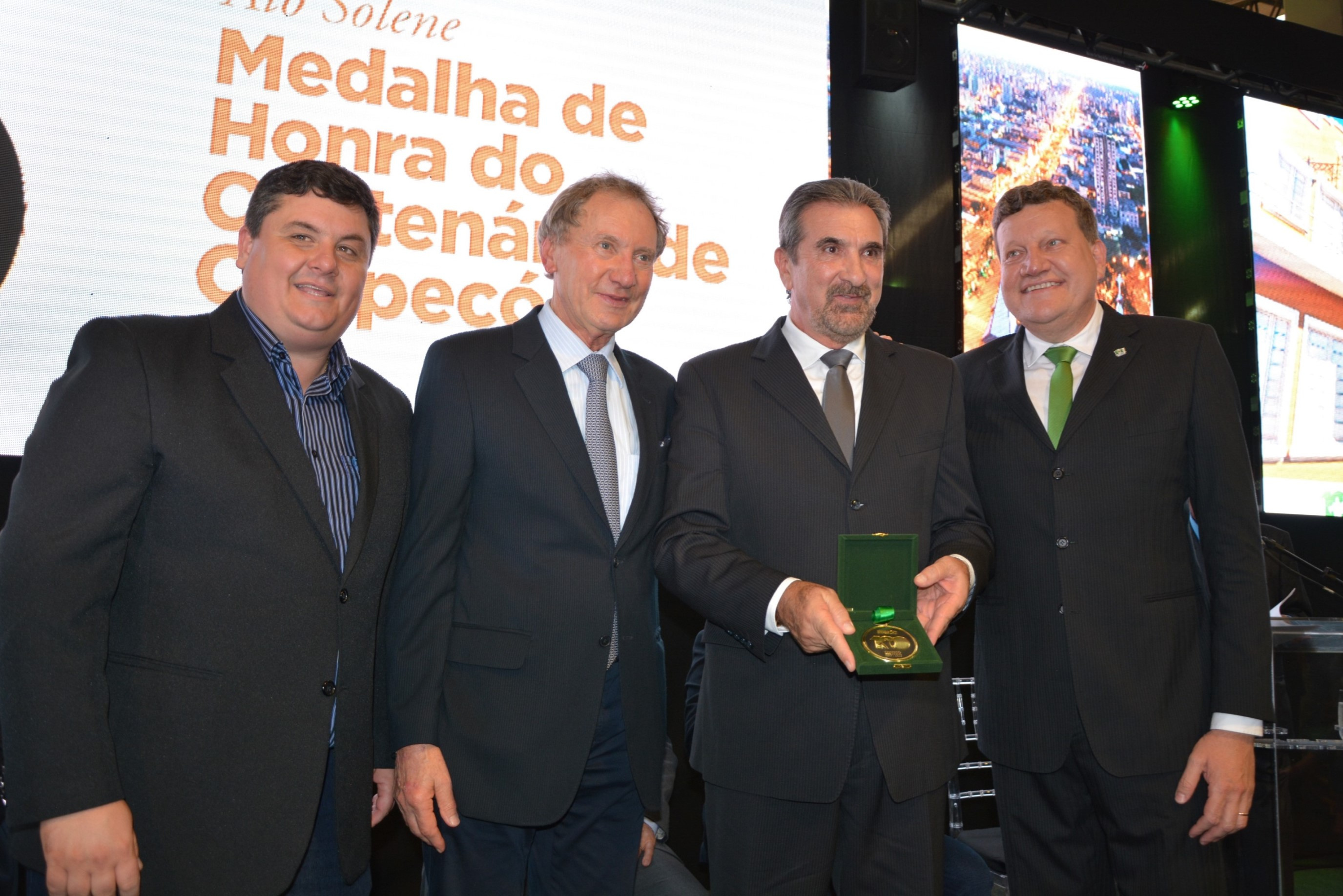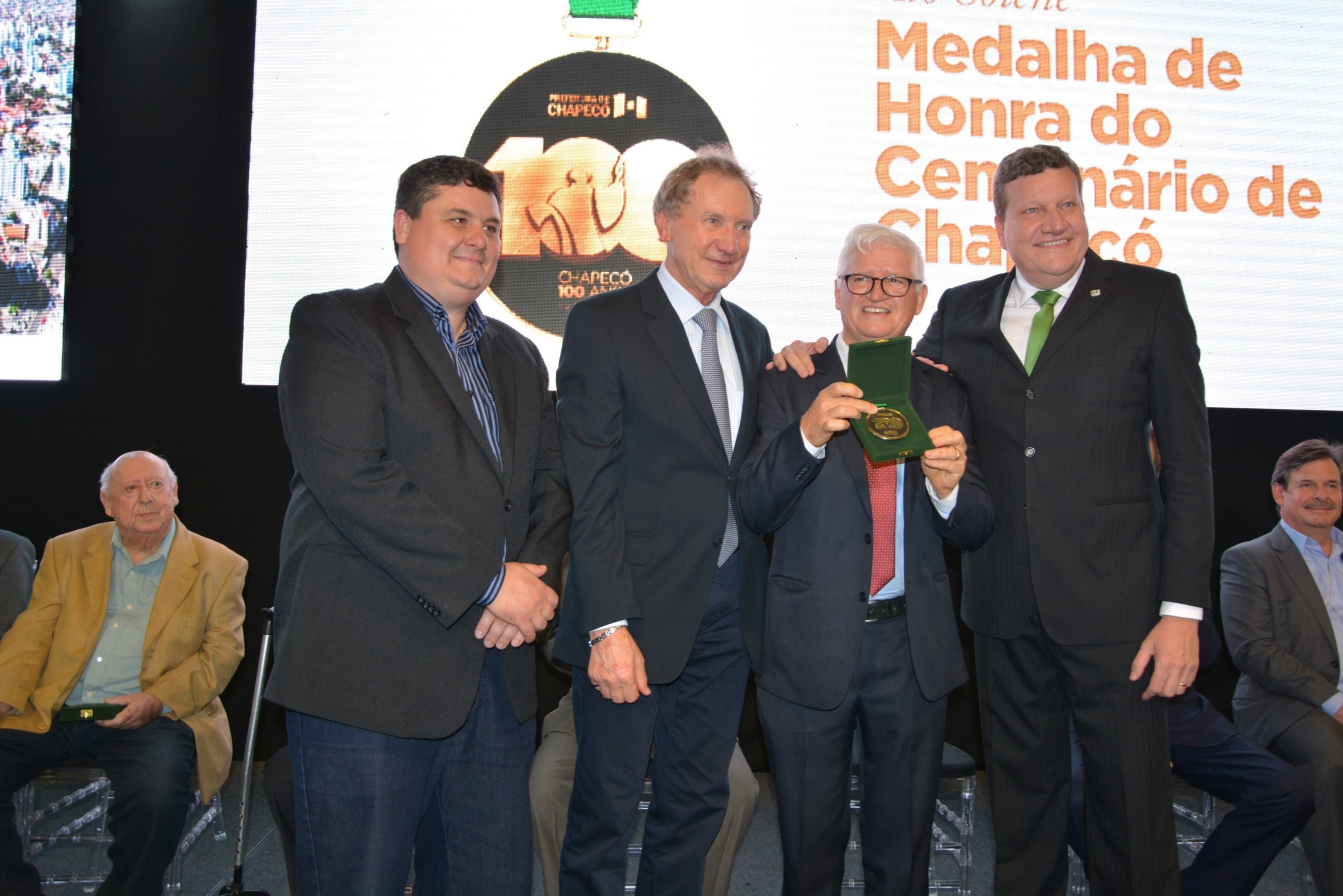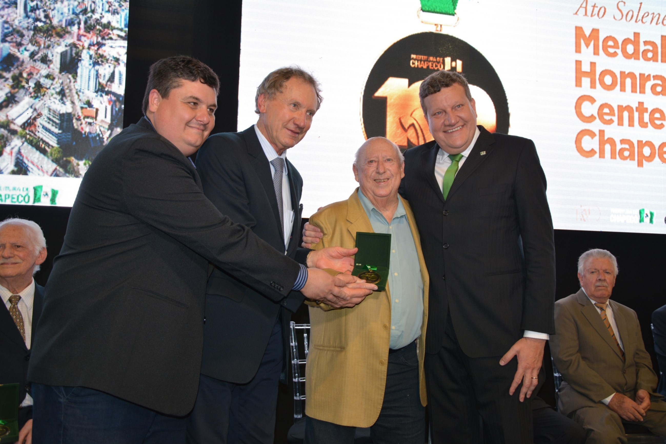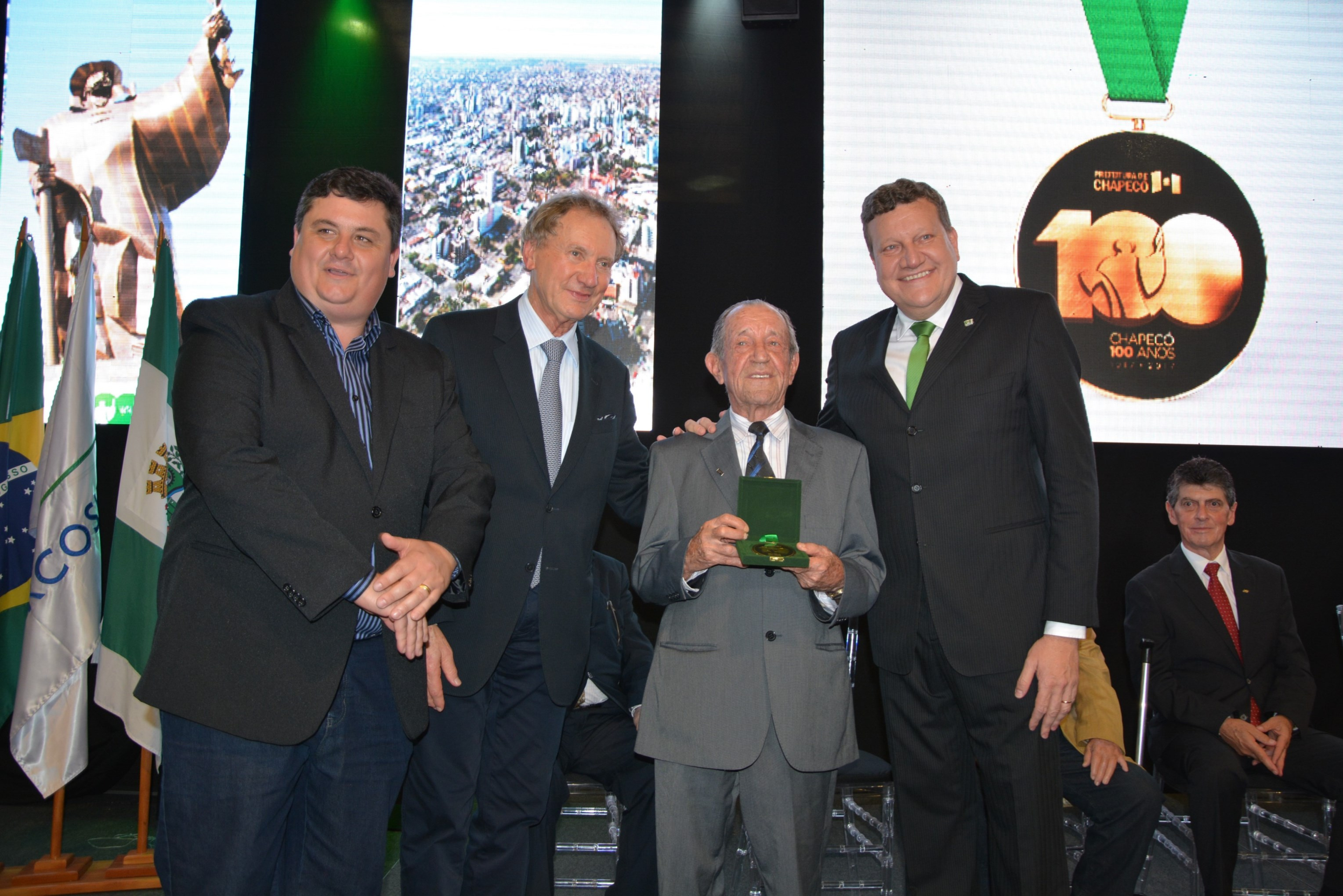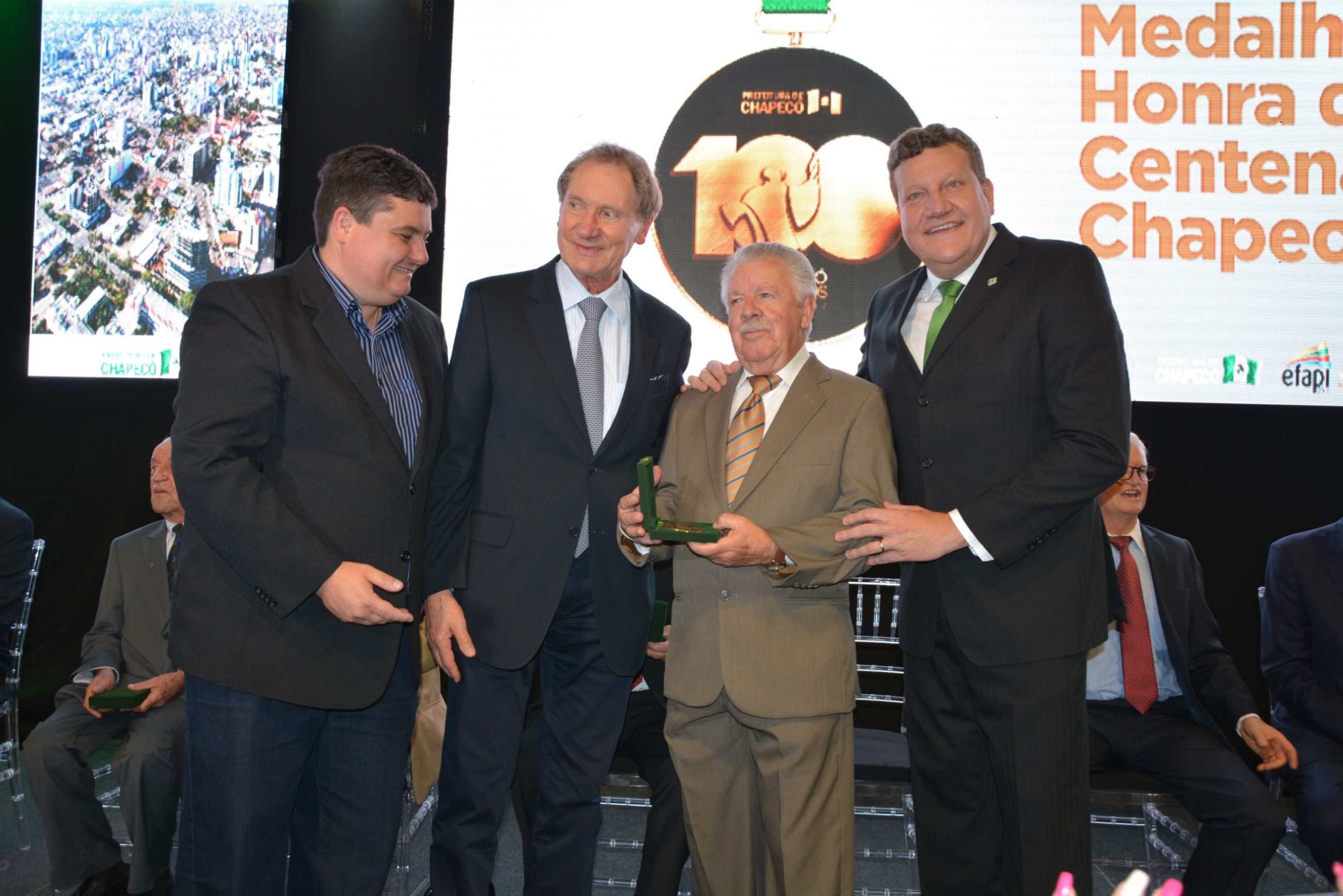 As homenagens foram entregues pelo prefeito, o presidente da Câmara de Vereadores, Valmor Junior Scolari e o ex-senador Casildo Maldaner. A medalha foi confeccionada especialmente para a ocasião e tem gravado o selo do centenário.