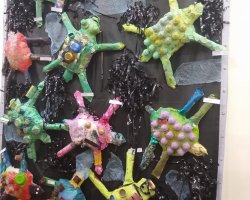 O laboratório de iniciação aliou os estudos das formas geométricas com introdução à figura humana, realizando um projeto que culminou na modelagem em argila e posterior queima a cerâmica. O laboratório 1 realizou seu projeto tendo como referência o estudo das tartarugas, através de desenho, recortes, colagem, origami, originando a tartaguga tridimensional de dobraduras e enchimento. O laboratório 2, partindo de muitos estudos/desenhos dos animais aquáticos, modelou e confeccionou um móbile de cerâmica.