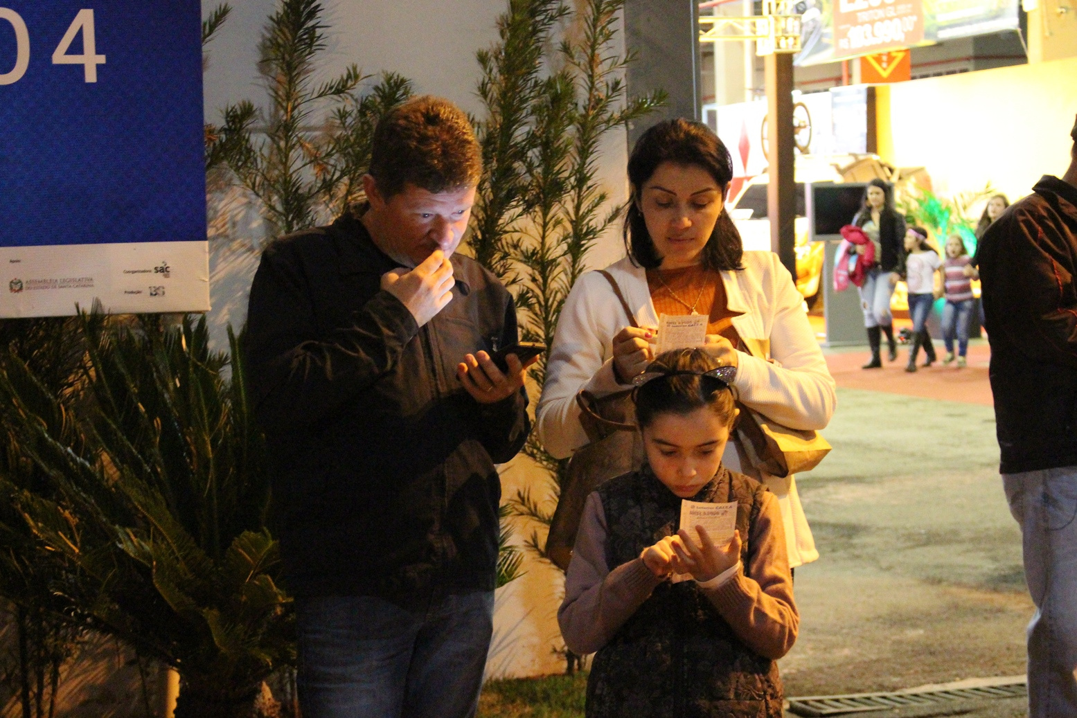 Já Quelen Santos, que esteve na feira junto a sua família, apresentou os sorteios de loteria para a filha Esther Santos. Nós participamos algumas vezes destes sorteios, mas nunca tínhamos visto a realização deles ao vivo, comenta.