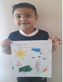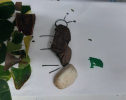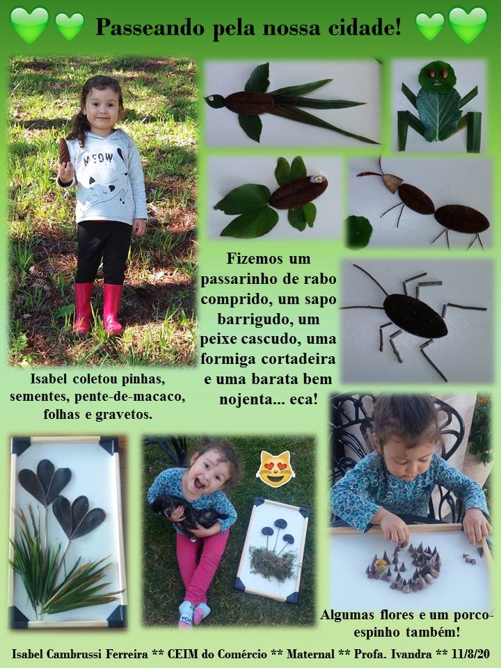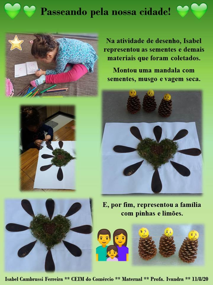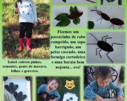 Com as crianças Bem Pequenas foi encaminhado que a família convidasse a criança para passear em algum lugar próximo a sua casa, no quintal, conforme suas possibilidades e mantendo as medidas de segurança. Durante o passeio, a família incentivou a criança a observar a paisagem, o percurso, conversando com ela sobre suas percepções e também para que a criança recolha alguns elementos naturais (pedrinhas, gravetos, folhas, sementes) que encontrar pelo caminho. Após chegar em casa, indagar a criança sobre o que observou, quais sensações teve, quais materiais encontrou e registrar essa observação através de desenho e na sequencia fazer uma criação artística como: bonecos (representando a família) e animais de graveto, casinha com as pedras, mandalas com sementes, folhas, deixando a criança expressar-se de forma livre.