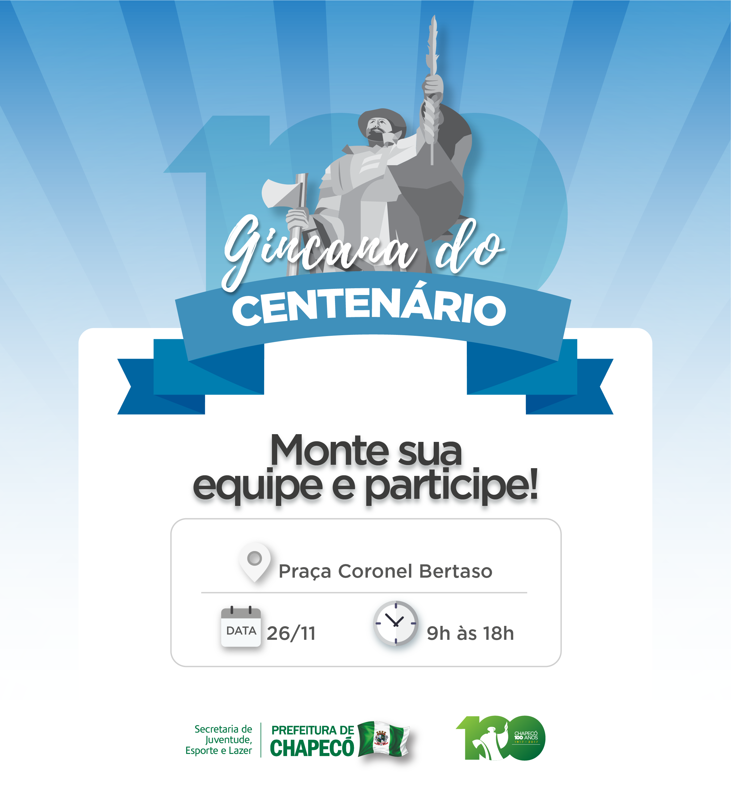 No domingo (26/11), das 09 às 18 horas acontecerá em Chapecó a 1ª edição da Gincana Municipal alusiva ao Centenário do Município. As inscrições foram prorrogadas e podem ser realizadas até o dia 22 de novembro na Secretaria de Juventude, Esporte e Lazer localizada da rua Clevelândia, 807-E, centro, das 13 às 19h. Mais informações pelos telefones (49) 3319-1050 ou (49) 9 8403-3230.