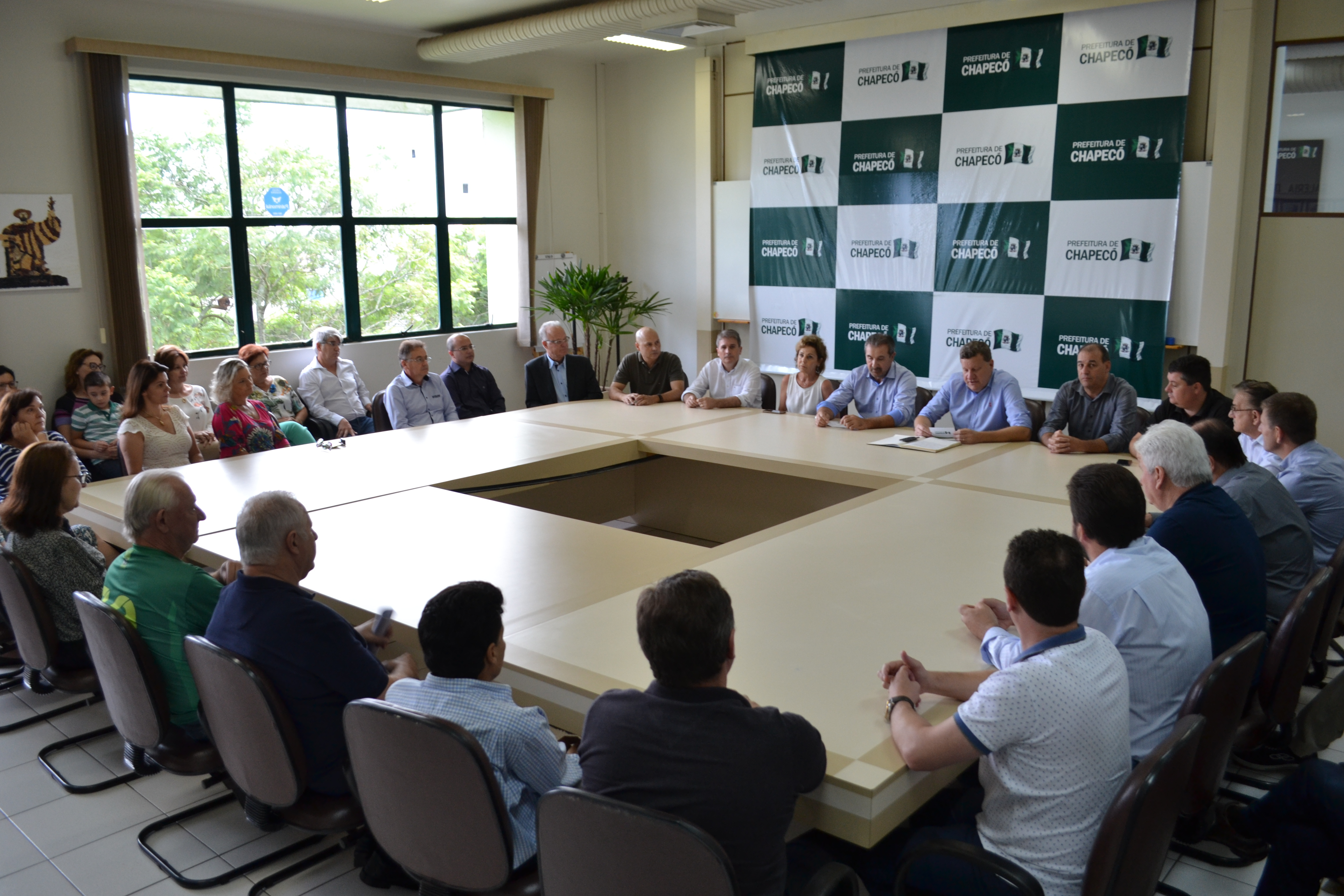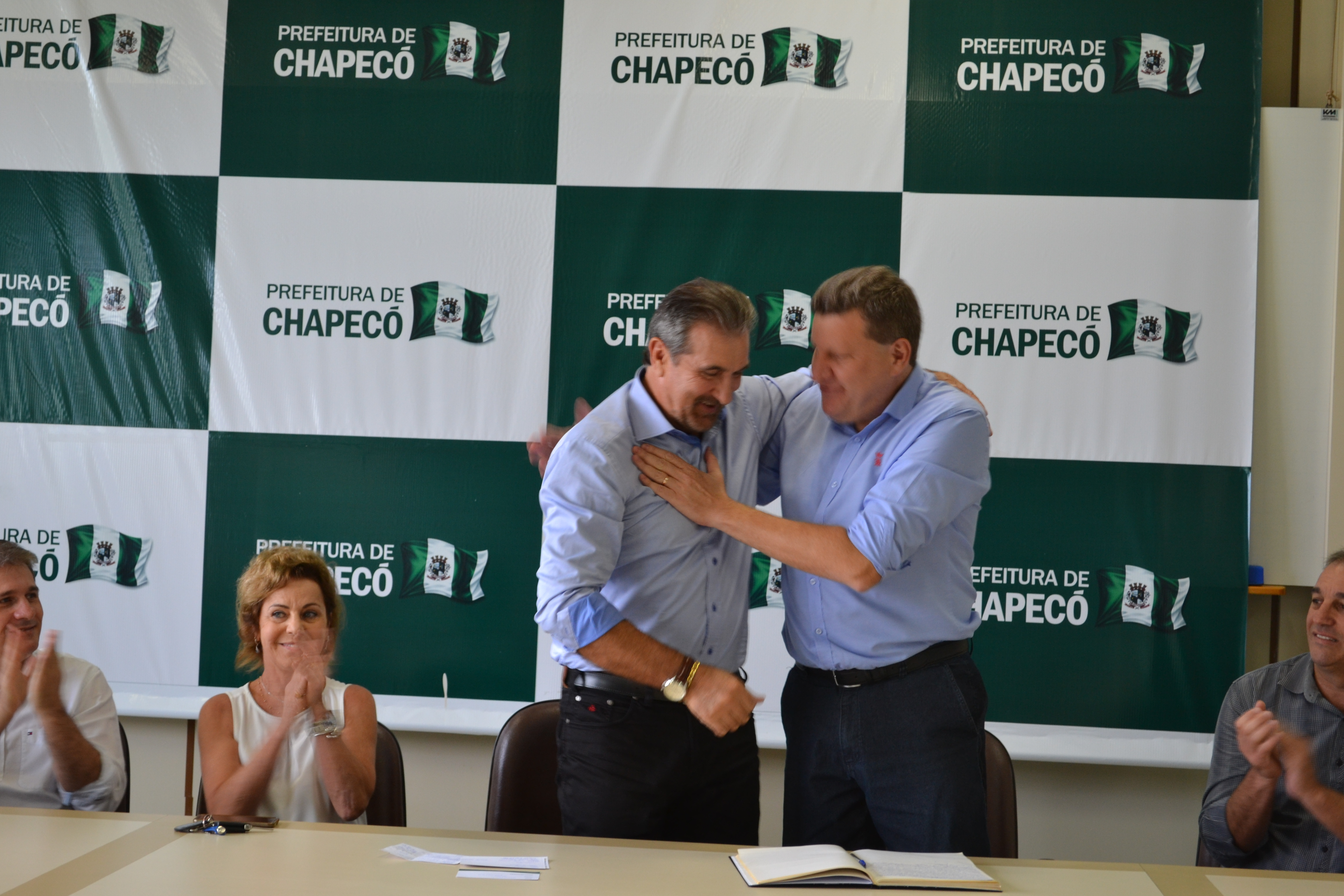 O Prefeito Luciano Buligon transmitiu o cargo, nesta manhã (15/01), ao Vice-Prefeito Elio Francisco Cella para gozar férias. O ato foi realizado na Sala de Reuniões da Prefeitura de Chapecó, anexa ao Gabinete, e contou com a presença de familiares, Secretários Municipais, demais servidores públicos, representantes de entidades, autoridades civis e militares.