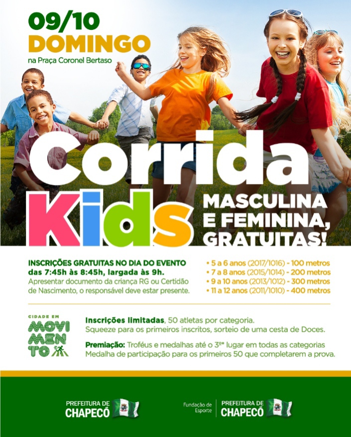Neste domingo Chapecó terá mais uma edição do Cidade em Movimento, com uma grande novidade, a corrida Kids, voltadas para crianças de 6 a 12 anos. As inscrições serão das 7h45 às 8h45, na Praça Coronel Bertaso. A largada, na Avenida Getúlio Vargas, será às 9h. O percurso é de 100m para categoria 5-6 anos, 200m para 7-8 anos, 300 para 9-10 anos e, 400m, para 11-12 anos.