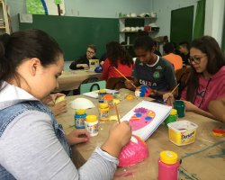 Aos poucos, o que era uma bexiga de ar encoberta com gesso e tinta acrílica branca começa ganhar formas e cores através do manuseio e da sensibilidade dos estudantes do 9º ano da Escola Básica Municipal Sereno Soprana. De acordo com a professora de Arte, Elizandra Aparecida De Almeida Bet, dentro da arte brasileira é trabalhado com os alunos a arte indígena e a partir do conteúdo estudado, os alunos são motivados a criar máscaras. A experimentação de diferentes materiais, criatividade, senso crítico, cores e trabalho coletivo embasou o trabalho, visando propiciar aos estudantes uma compreensão aprofundada da arte indígena ligada às questões sociais, possibilitando percepção através dos sentidos, das imagens, dos sons, das impressões ou das sensações externas a partir da vivência de cada um, transformar em arte própria, explicou.
