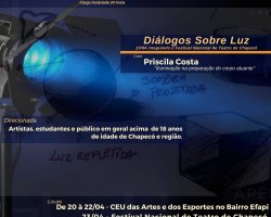 As atividades terão início na sexta-feira, dia 20 de abril e seguem até a segunda-feira, dia 23. A formação soma uma carga horária de 20h e a programação prevê capacitação com o paulista Flávio Andrade, que traz na bagagem uma longa experiência como iluminador, com trabalhos marcantes na carreira com espetáculos teatrais nacionais e shows de artistas da música brasileira. E finaliza com mesa redonda Diálogos sobre luz - A iluminação na preparação do corpo atuante, com a atriz e iluminadora Priscila Costa, pesquisadora na área de iluminação cênica. O debate deseja provocar todos os participantes da cena, entre eles os atores, músicos e bailarinos para conversar sobre a percepção da luz, do espaço e da possibilidade da criação.