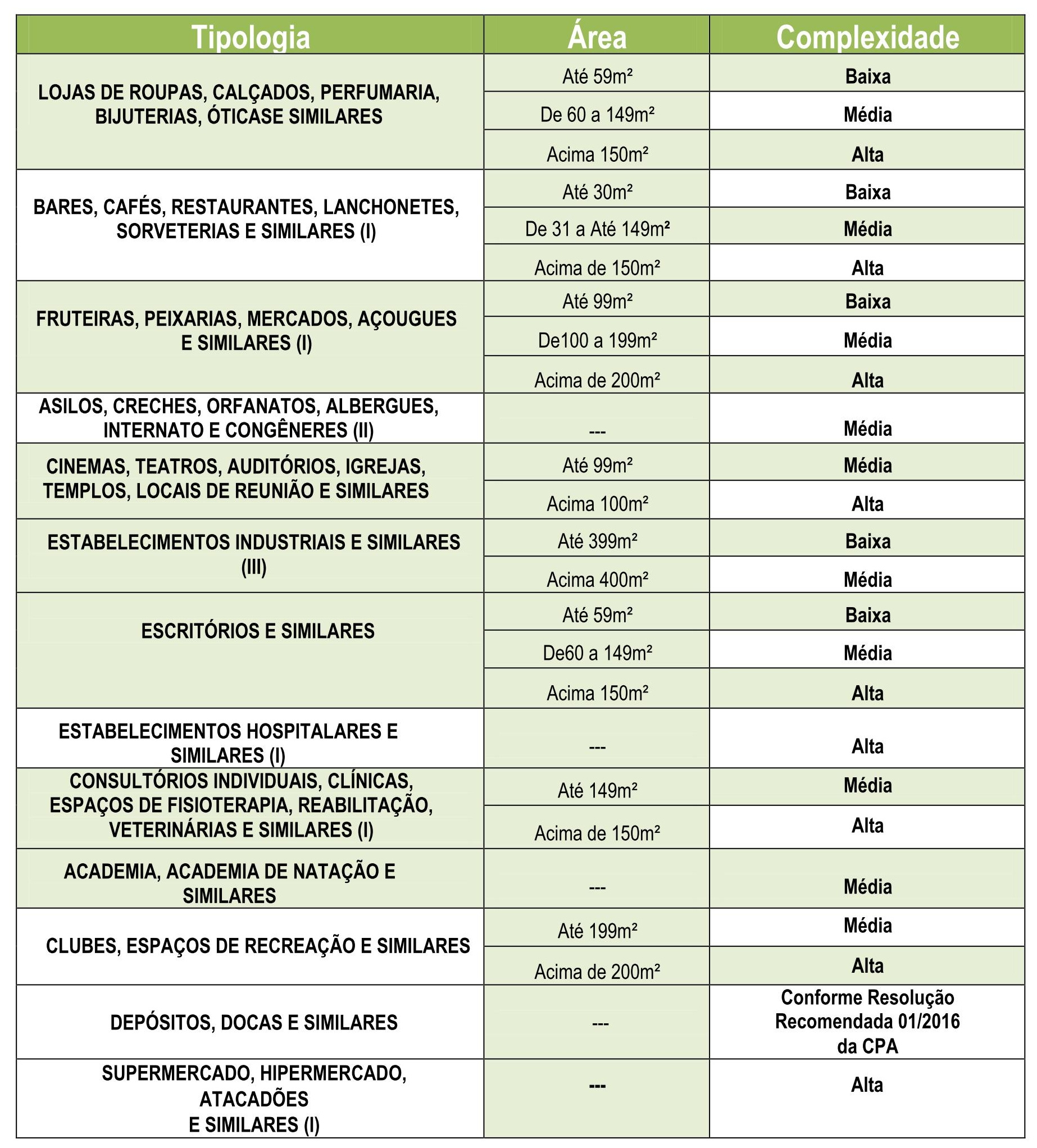 Foi estabelecida uma tabela de classificação de complexidade de acordo com cada atividade e a área construída para fins exclusivos de concessão do alvará. A Tabela foi criada pela CPA justamente para auxiliar na simplificação dos processos que envolvem a acessibilidade. Antes desta normativa, não havia divisão. As novas orientações têm efeitos retroativos a 6 de janeiro de 2016 e poderá ser revista no prazo de 180 dias.