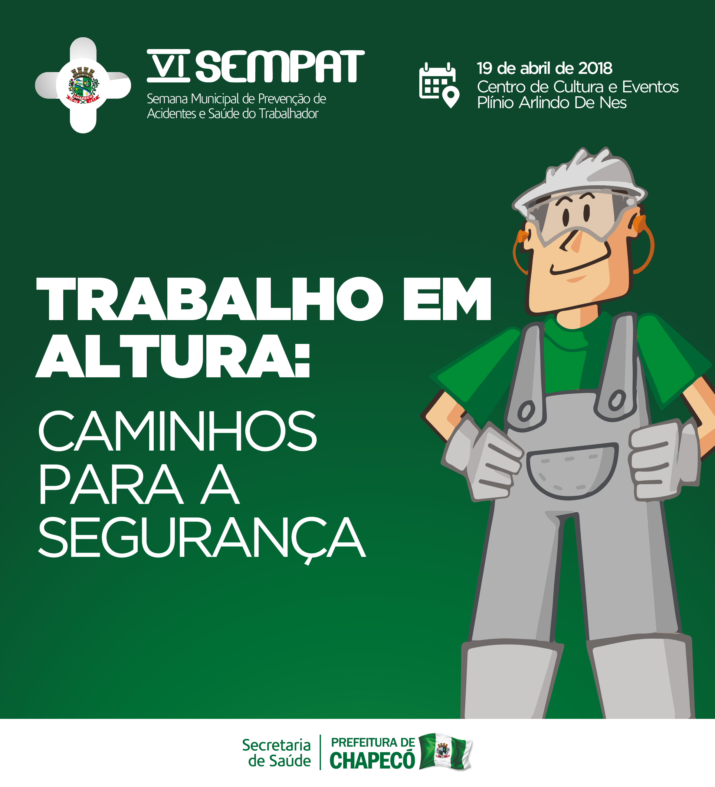 Debater esse assunto e sensibilizar à população sobre a importância da prevenção dos acidentes de trabalho e doenças ocupacionais são assuntos que estarão na programação da VI Sempat Semana Municipal de Prevenção de Acidentes e Saúde do Trabalhador terá palestra e atividades de prevenção e orientação e que acontecerá nesta quinta-feira (19) no Centro de Cultura e Eventos Plínio Arlindo De Nes, na sala Agostinho Duarte em Chapecó. O foco principal são os acidentes de trabalho em altura e os caminhos para a segurança. Além da programação de palestras, haverá exposição de fotografias do Concurso Fotográfico Abril Verde Pela saúde e segurança no trabalho" tem como objetivo incentivar a observação e reconhecimento das situações de risco às quais os trabalhadores estão expostos, oportunizando a tomada de ações de prevenção de acidentes e promoção à saúde do trabalhador.