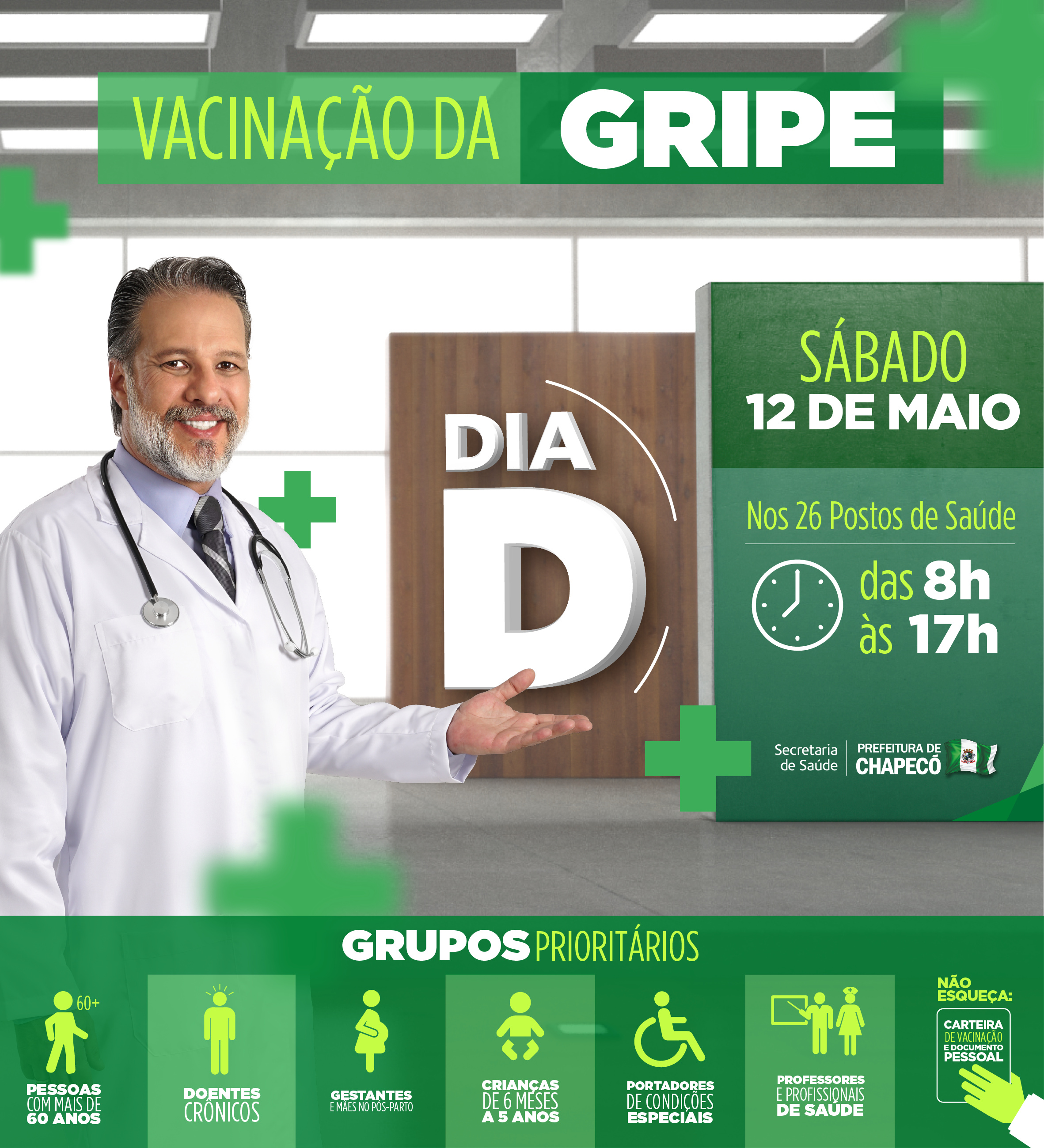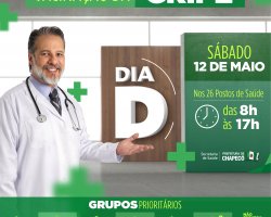 Segue até o dia 01 de junho a Campanha Nacional de Vacinação Contra Influenza (gripe). No dia 12 de maio (sábado) será Dia D de mobilização nacional. Neste dia os 26 Centros de Saúde da Família de Chapecó estarão atendendo 8 às 17 horas sem fechar ao meio dia. Durante os demais dias, os Centros de Saúde atendem das 7h30 às 11h30 e das 13 às 17 horas.