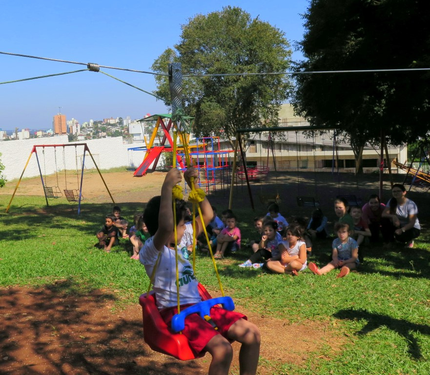 Dentre os objetivos da ação está possibilitar através da aprendizagem a construção da autonomia e da criatividade, estabelecendo uma estreita relação entre brincar e aprender, desenvolvendo na criança tanto o aspecto social, o cultural e o afetivo. Para o aluno Antony Zanesco de 5 anos o Cantinho da Aventura é muito divertido. Adorei brincar na tirolesa e no escorrega de sabão. Vou brincar ainda na escalada de pneus e no slackline, adiantou.