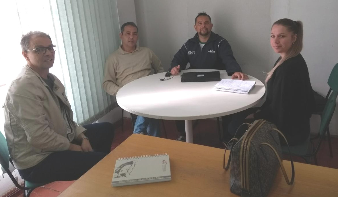 Reunião entre a articuladora de Educação Física da Secretaria de Educação, Giovana Voelz, e os professores do Programa Atleta do Futuro, Antônio Rodrigues da modalidade de Karate e Carlos Konishi do Judô e o coordenador das equipes de rendimento, professor José Odacir dos Santos Júnior, tratou da formação continuada dos professores da rede municipal de ensino na modalidade de lutas. As formações ficaram marcadas para os dias 23 e 30 de maio no Ginásio de Esportes Ivo Silveira, das 08 às 11h15min.