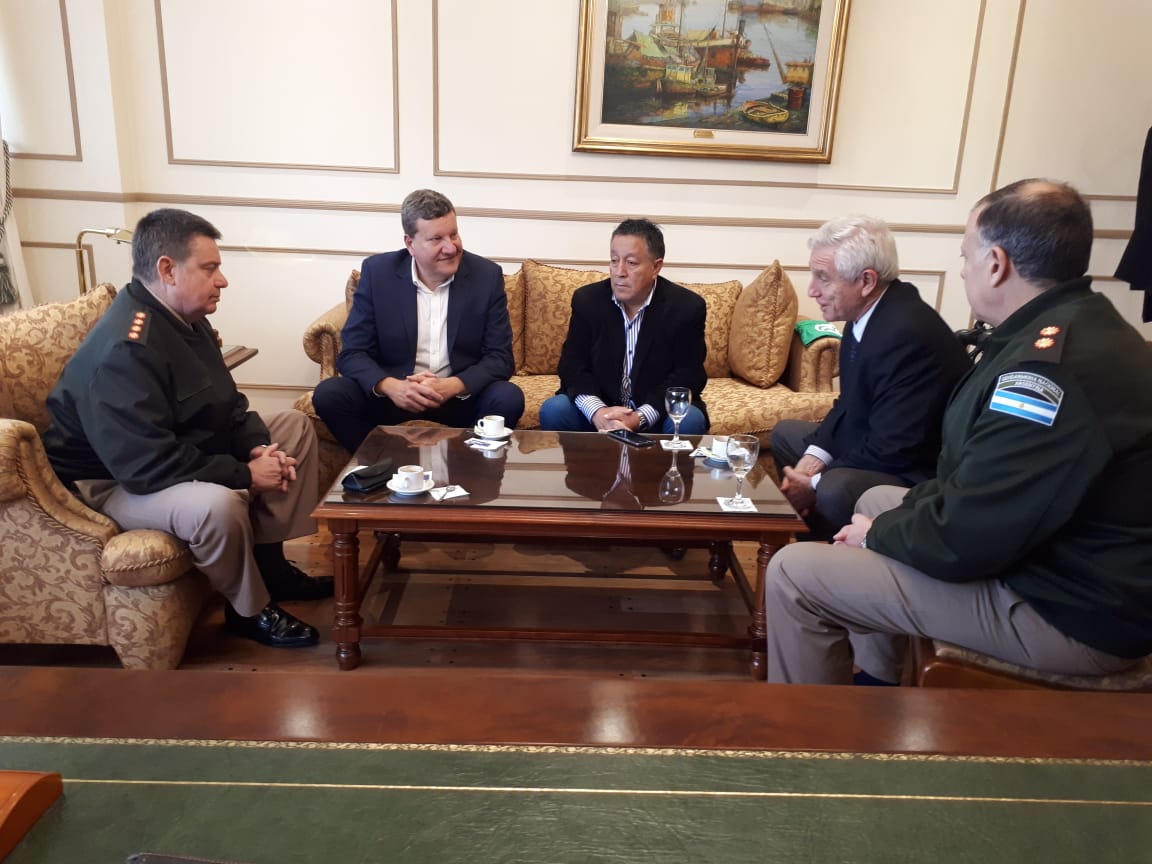 Legenda foto 01: (da esquerda para direita) Prefeito Luciano Buligon em reunião com o Comandante General Gerardo José Otero, Diretor Nacional de Gendarmeria; o Senhor Ramón Ortellado, Secretário Geral do Bripaem; Fernando Gallardo, Consultor do Bripaem; e o Comandante General Guilhermo Alberto Igartua, Secretário Geral da Gendarmeria Nacional.