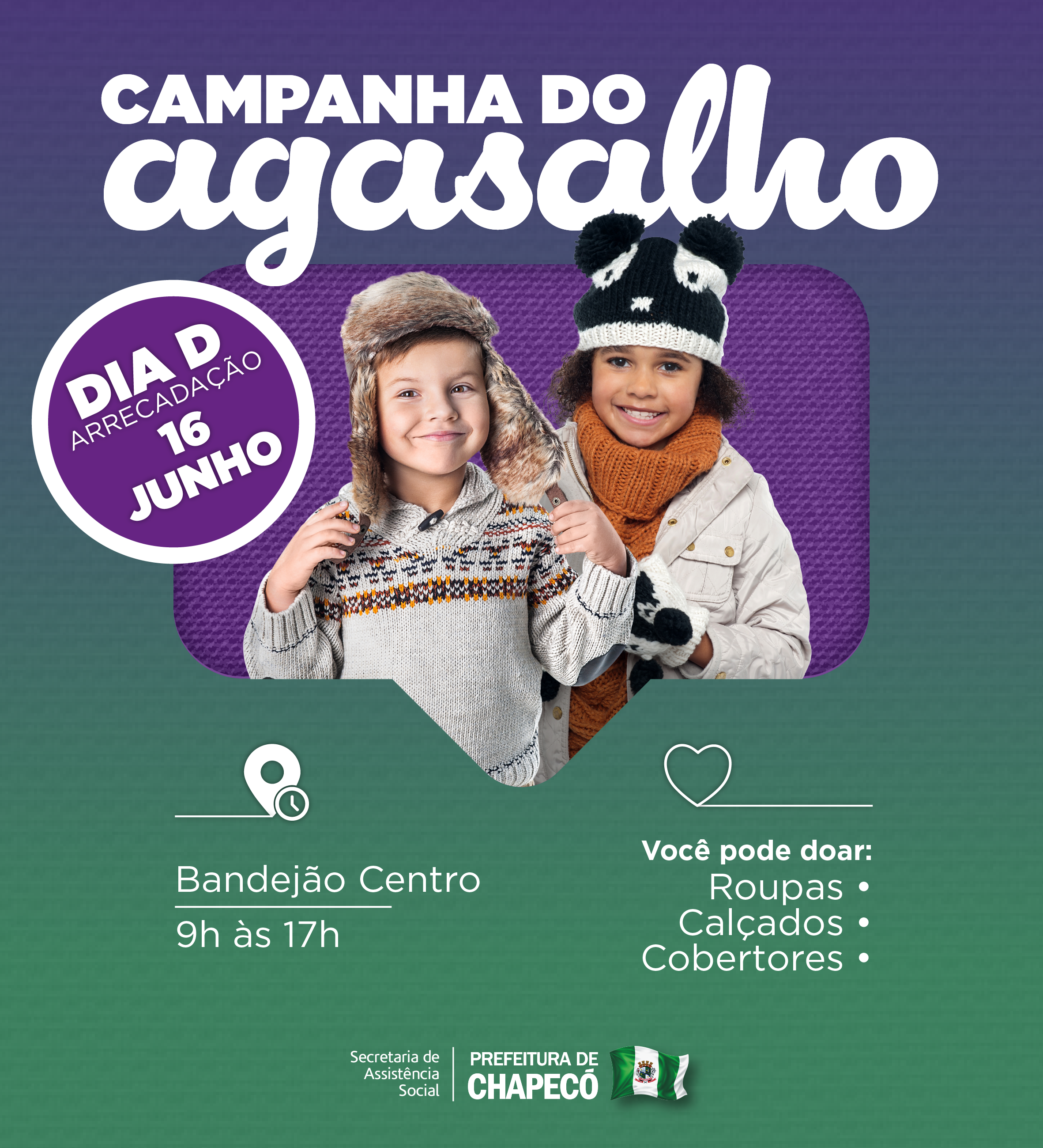 Sabe aquelas roupas e cobertores de inverno que você não usa mais? Na vida de muitas pessoas, eles podem fazer a diferença. Por isso, a Prefeitura de Chapecó, por meio, da Secretaria de Assistência Social, realiza no sábado (16) o Dia D de arrecadação da Campanha do Agasalho 2018. Das 09 às 17 horas, as equipes estarão reunidas no Restaurante Popular Bandejão - do Centro para receber suas doações. Esse dia é uma oportunidade para as famílias chapecoenses reunirem roupas, calçados e cobertores, em bom estado e fazer a doação.
