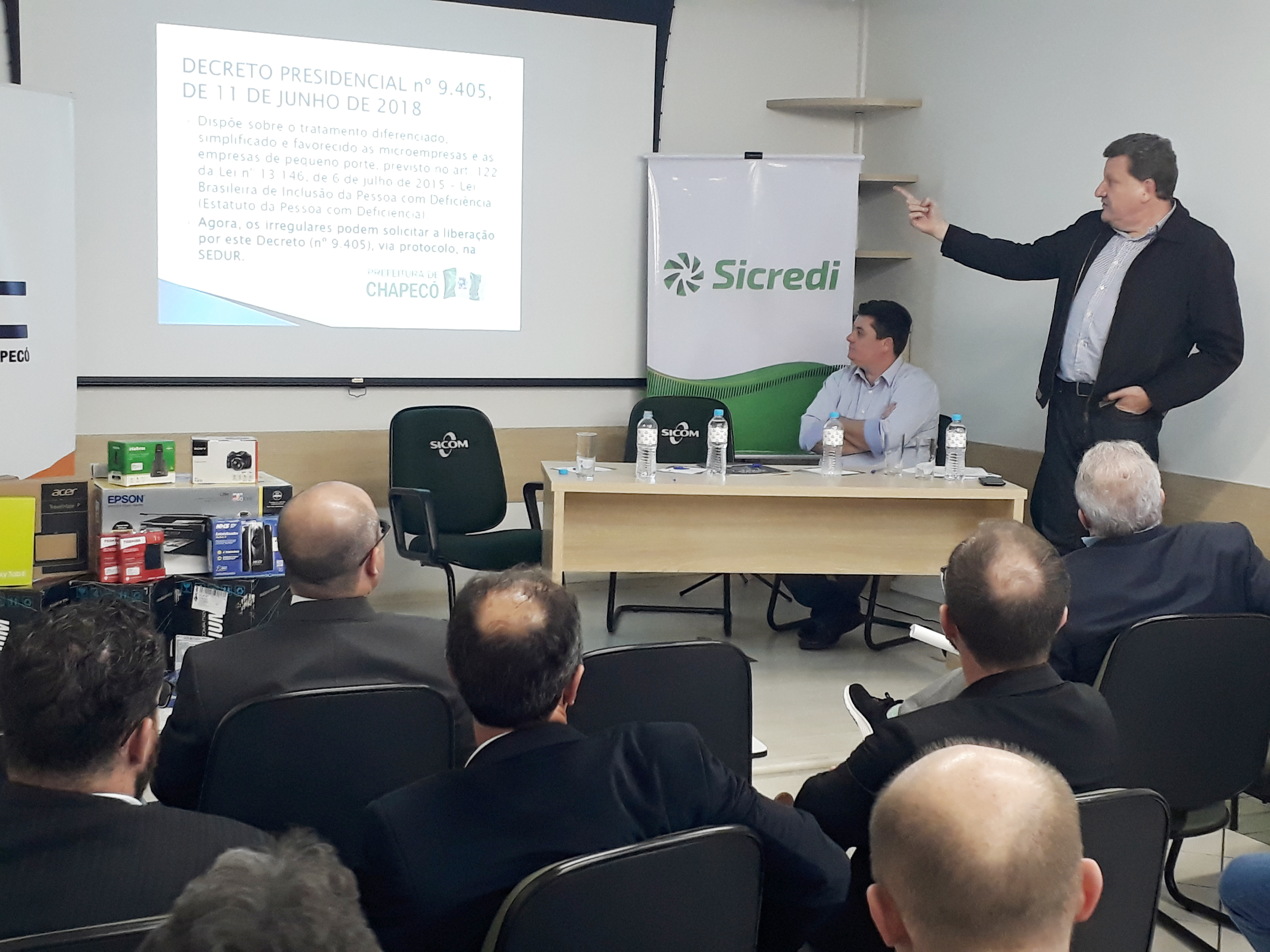 A assinatura do decreto 9.405, de 11 de junho passado, pelo presidente Michel Temer, foi assunto que levou o prefeito Luciano Buligon a participar de reunião do Centro Empresarial de Chapecó (CEC) nesta segunda-feira, 2 de julho. Essa nova legislação, prevista na lei 13.146/2015, ou Lei Brasileira de Inclusão da Pessoa com Deficiência, institui tratamento diferenciado e simplificado às microempresas e empresas de pequeno porte e vigora desde 22 de junho. O novo decreto reafirmou definições da legislação do município.
