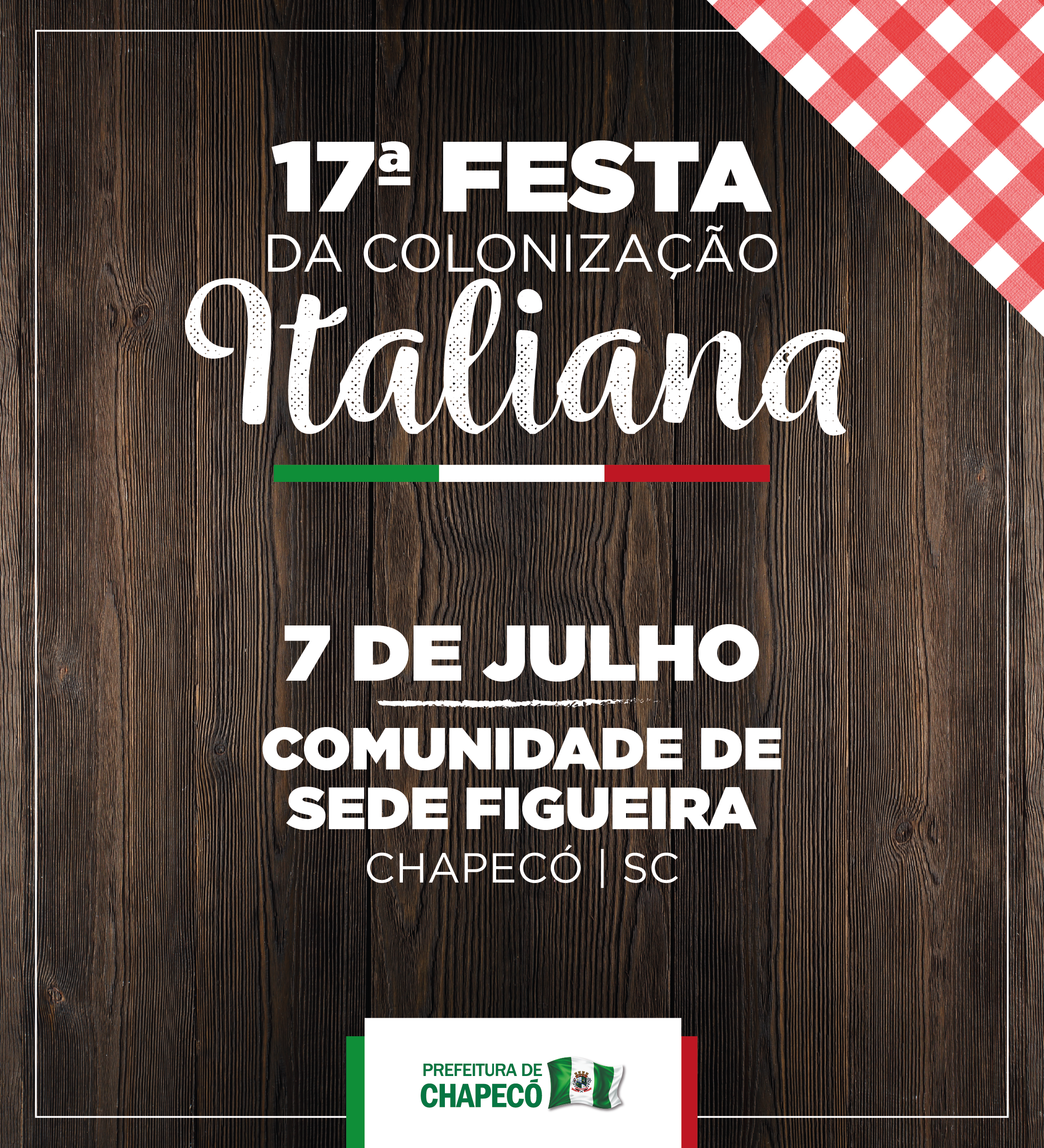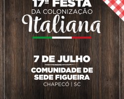 Música, dança, apresentações culturais, comidas e bebidas típicas marcam a 17ª edição da Festa da Colonização Italiana, que acontece neste sábado, dia 7 de julho, na comunidade de Sede Figueira, em Chapecó. A programação terá início às 18h com celebração, seguida de jantar típico, apresentações culturais e animação com Musical Bergamin.