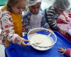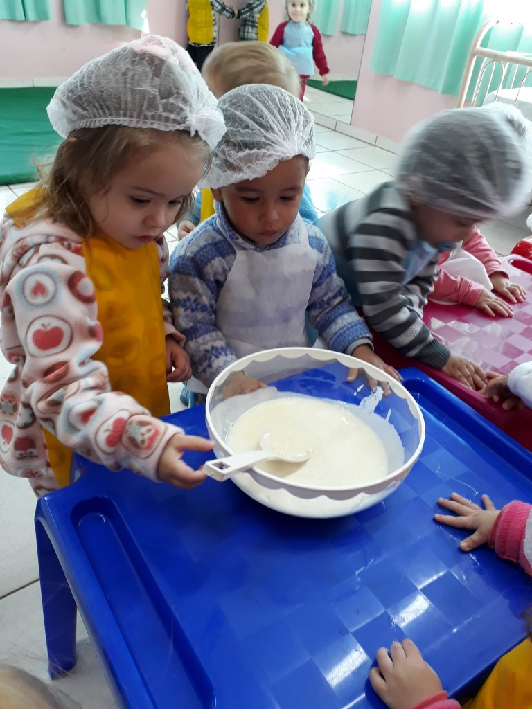 A atividade iniciou com conversas na sala sobre uma alimentação equilibrada e diversificada. A partir dessa conversa, a professora mostrou um livro de receitas, sempre conversando e interagindo com as crianças na sala. Também disponibilizou para as famílias uma muda de Kefir (bichinho que faz o iogurte natural) com informações sobre suas propriedades nutritivas, e solicitou que junto com a criança, preparassem o iogurte. Junto com as famílias a criança foi observando o processo e pedindo para os pais anotarem, além de fotografar todo o processo, contando como foi a experiência. Na escola, a professora também organizou um lanche a base do Kefir. Foi um pudim de kefir, que as crianças ajudaram a fazer e depois degustaram.
