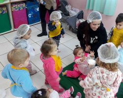 De acordo com a professora Gracieli Bottini Ribeiro, após observações diárias e sabendo que as crianças estão em processo de formação do sistema imunológico, pesquisamos sobre alimentos que pudessem contribuir para o fortalecimento das defesas do organismo. Através de leituras e por saber da grande propriedade nutritiva do Kefir - um alimento natural usado de diversas formas na culinária e que cuida do corpo de dentro para fora, descobrimos que ele é rico em cálcio, vitaminas, probiótico e em outros nutrientes. A professora comentou que por ser um alimento pouco conhecido, foram desenvolvidas atividades sobre ele em sala e com as famílias. Além de ser uma atividade divertida, proporcionou um momento de aprendizado estimulando uma alimentação saudável e o conhecimento de um novo alimento, explicou.